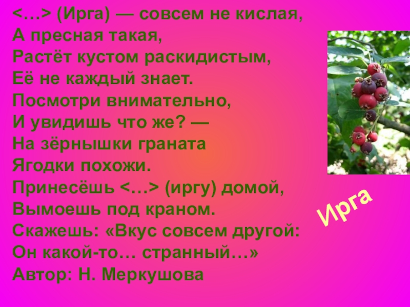 Растёт кустом раскидистым, Её не каждый знает. Посмотри внимательно, И увидишь что же? — На зёрнышки граната Ягодки похожи. Принесёшь <…> (иргу) домой, Вымоешь под краном. Скажешь: «Вкус совсем другой: Он какой-то… странный…» Автор: Н. Меркушова