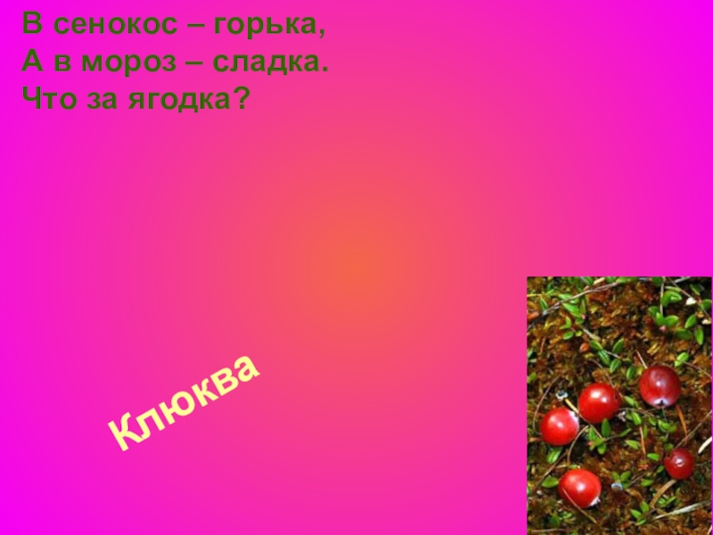 Клюква В сенокос – горька, А в мороз – сладка. Что за ягодка?
