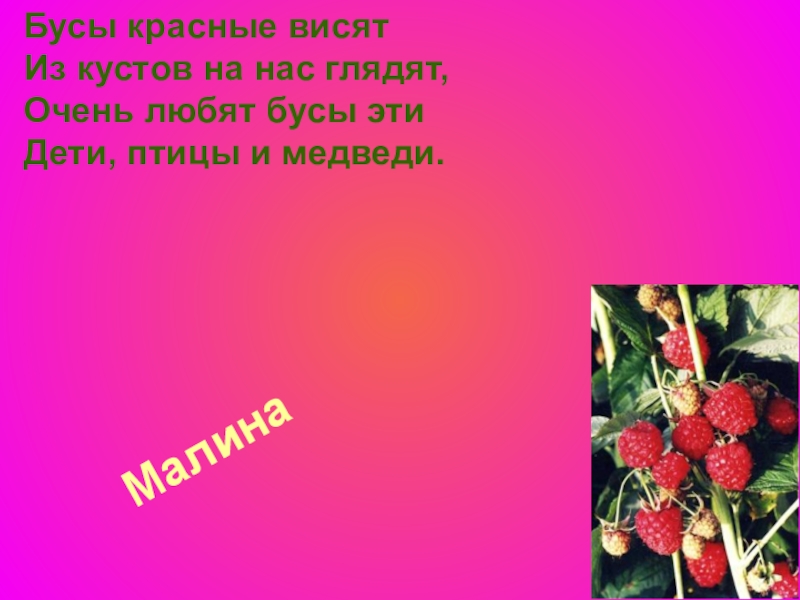 Малина Бусы красные висят Из кустов на нас глядят, Очень любят бусы эти Дети, птицы и медведи.