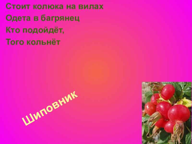 Шиповник Стоит колюка на вилахОдета в багрянецКто подойдёт,Того кольнёт