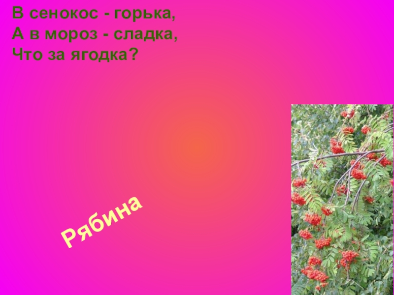 Рябина В сенокос - горька,  А в мороз - сладка,  Что за ягодка?
