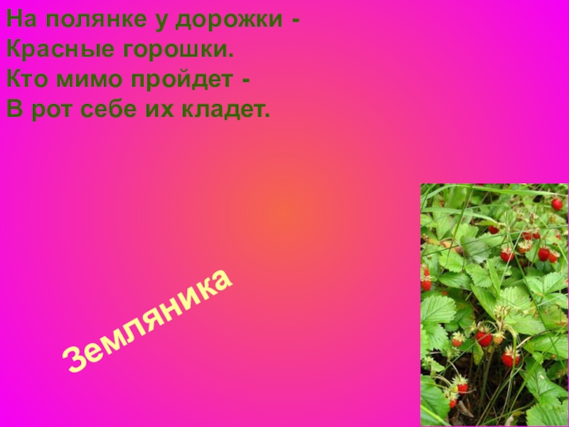 Земляника На полянке у дорожки - Красные горошки. Кто мимо пройдет - В рот себе их кладет.