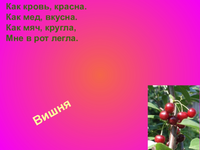 Вишня  Как кровь, красна. Как мед, вкусна. Как мяч, кругла, Мне в рот легла.