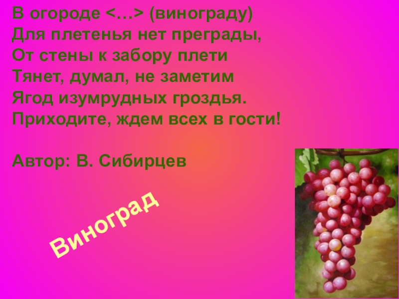 Виноград В огороде (винограду) Для плетенья нет преграды, От стены к забору плети Тянет, думал, не заметим