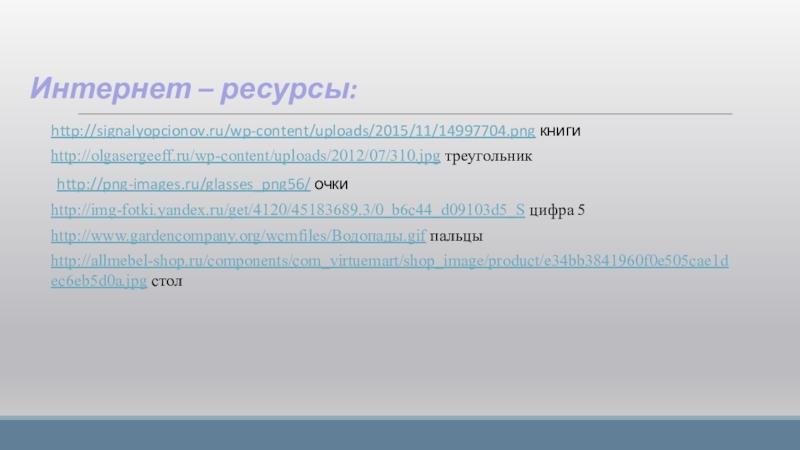 http://signalyopcionov.ru/wp-content/uploads/2015/11/14997704.png книгиhttp://olgasergeeff.ru/wp-content/uploads/2012/07/310.jpg треугольникhttp://png-images.ru/glasses_png56/ очкиhttp://img-fotki.yandex.ru/get/4120/45183689.3/0_b6c44_d09103d5_S цифра 5http://www.gardencompany.org/wcmfiles/Водопады.gif пальцыhttp://allmebel-shop.ru/components/com_virtuemart/shop_image/product/e34bb3841960f0e505cae1dec6eb5d0a.jpg столИнтернет – ресурсы: