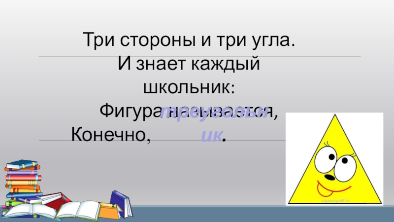 Три стороны и три угла.И знает каждый школьник:Фигура называется,Конечно, …треугольник.