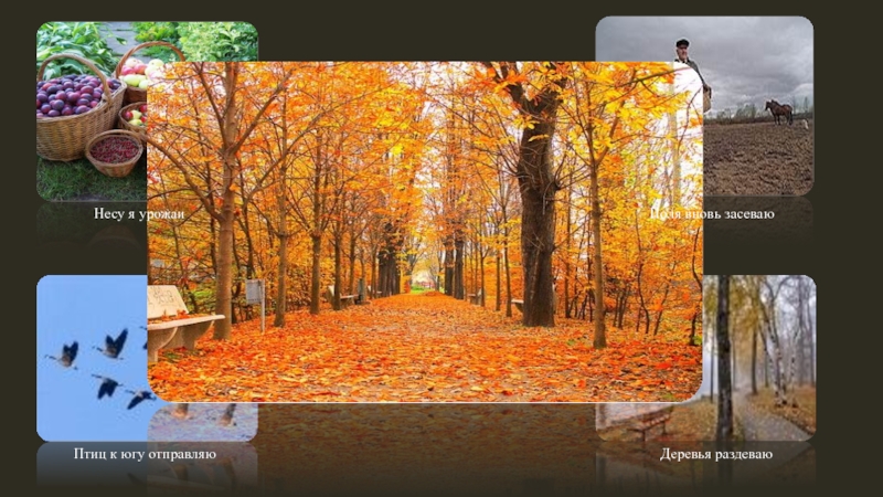 Несу я урожаиПоля вновь засеваюПтиц к югу отправляюДеревья раздеваю