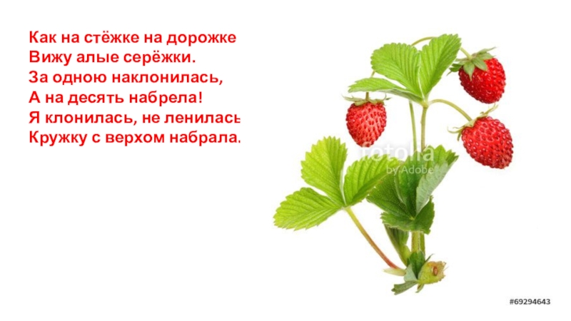 Как на стёжке на дорожкеВижу алые серёжки.За одною наклонилась,А на десять набрела!Я клонилась, не ленилась,Кружку с верхом