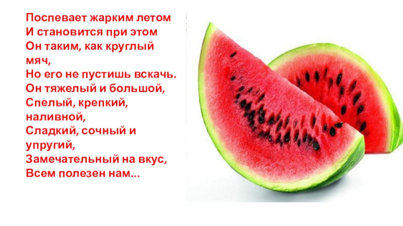 Поспевает жарким летом И становится при этом Он таким, как круглый мяч, Но его не пустишь вскачь. Он тяжелый и большой, Спелый, крепкий, наливной, Сладкий, сочный и упругий, Замечательный на вкус, Всем полезен нам...