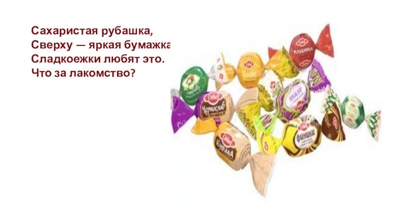 Сахаристая рубашка,Сверху — яркая бумажка.Сладкоежки любят это.Что за лакомство?