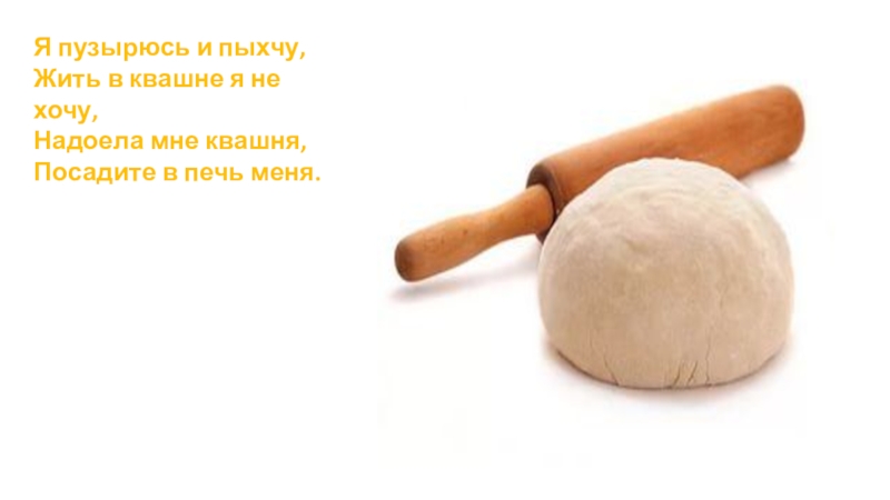 Я пузырюсь и пыхчу,Жить в квашне я не хочу,Надоела мне квашня,Посадите в печь меня.