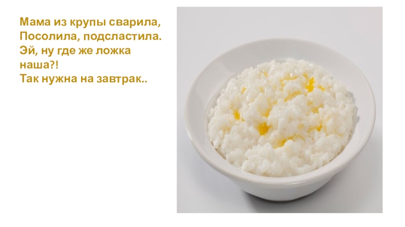 Мама из крупы сварила,Посолила, подсластила.Эй, ну где же ложка наша?!Так нужна на завтрак..