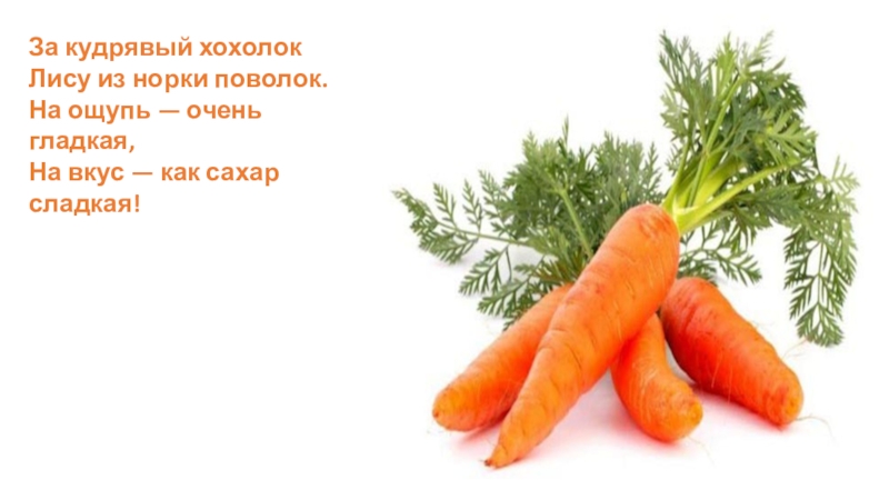 За кудрявый хохолокЛису из норки поволок.На ощупь — очень гладкая,На вкус — как сахар сладкая!