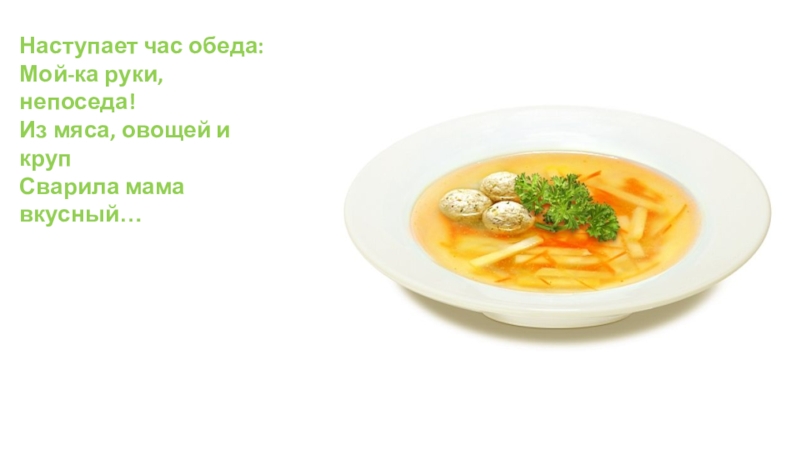 Наступает час обеда:Мой-ка руки, непоседа!Из мяса, овощей и крупСварила мама вкусный…