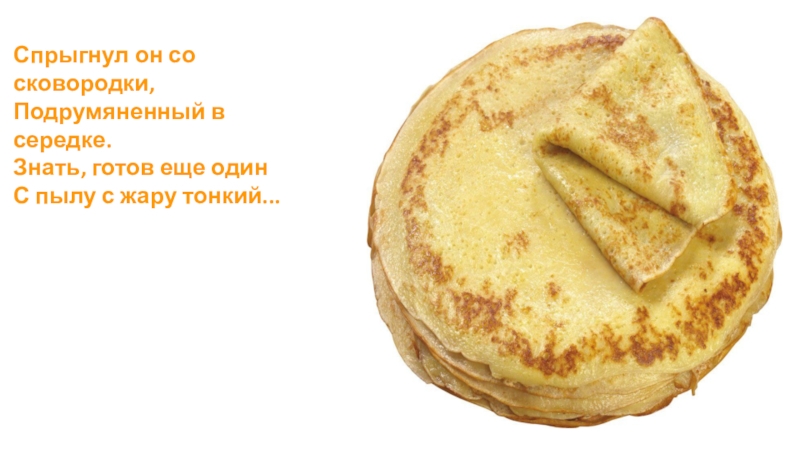 Спрыгнул он со сковородки,Подрумяненный в середке.Знать, готов еще одинС пылу с жару тонкий...