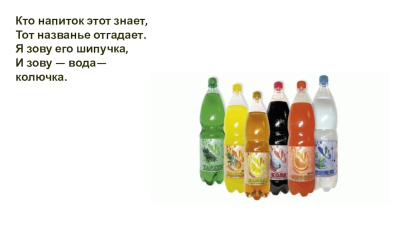 Кто напиток этот знает,Тот названье отгадает.Я зову его шипучка,И зову — вода—колючка.