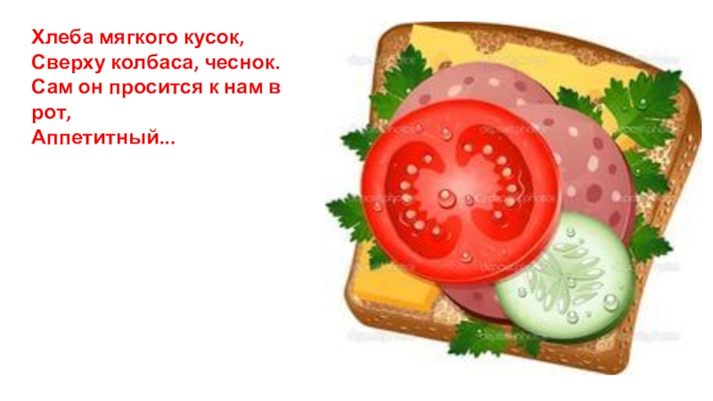 Хлеба мягкого кусок,Сверху колбаса, чеснок.Сам он просится к нам в рот,Аппетитный...