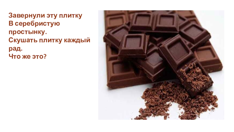 Завернули эту плиткуВ серебристую простынку.Скушать плитку каждый рад.Что же это?