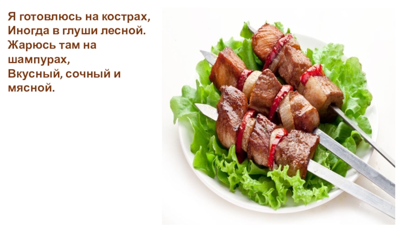 Я готовлюсь на кострах,Иногда в глуши лесной.Жарюсь там на шампурах,Вкусный, сочный и мясной.