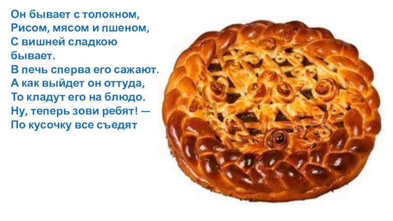 Он бывает с толокном,Рисом, мясом и пшеном,С вишней сладкою бывает.В печь сперва его сажают.А как выйдет он