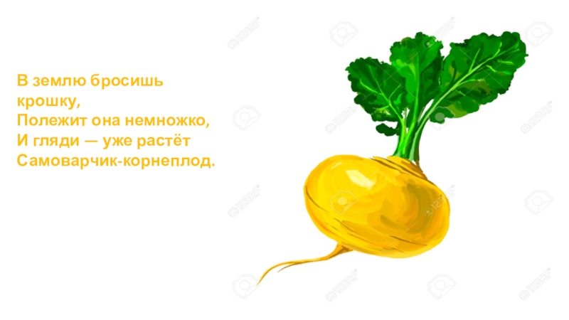В землю бросишь крошку, Полежит она немножко, И гляди — уже растёт Самоварчик-корнеплод.