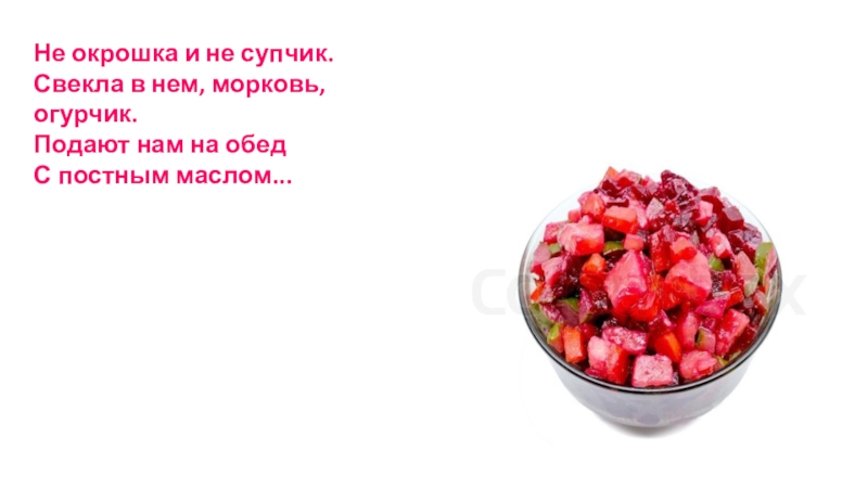 Не окрошка и не супчик.Свекла в нем, морковь, огурчик.Подают нам на обедС постным маслом...