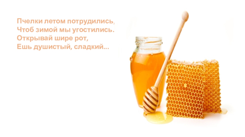 Пчелки летом потрудились,Чтоб зимой мы угостились.Открывай шире рот,Ешь душистый, сладкий...