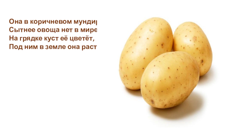 Она в коричневом мундире,Сытнее овоща нет в мире. На грядке куст её цветёт, Под ним в земле