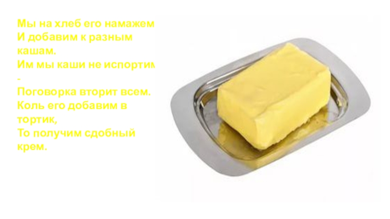 Мы на хлеб его намажемИ добавим к разным кашам.Им мы каши не испортим -Поговорка вторит всем.Коль его