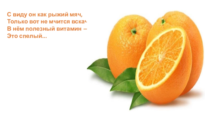 С виду он как рыжий мяч,Только вот не мчится вскачь.В нём полезный витамин — Это спелый...