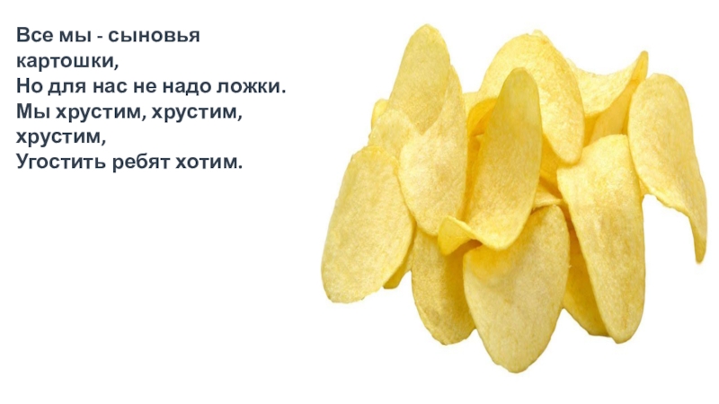 Все мы - сыновья картошки,Но для нас не надо ложки.Мы хрустим, хрустим, хрустим,Угостить ребят хотим.