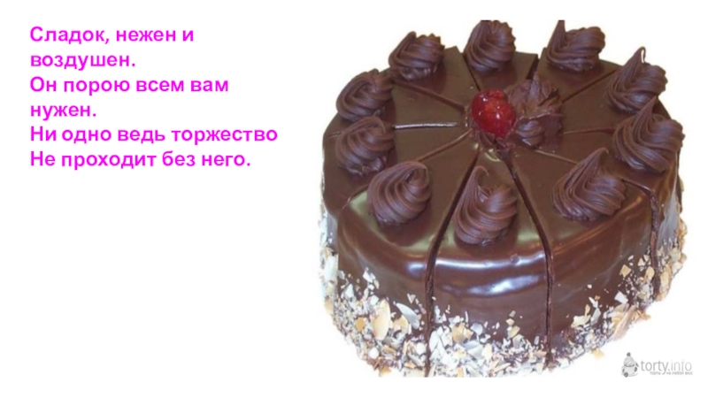 Сладок, нежен и воздушен.Он порою всем вам нужен.Ни одно ведь торжествоНе проходит без него.