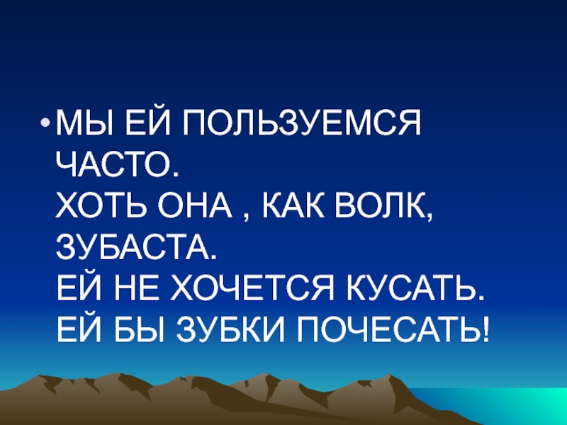 МЫ ЕЙ ПОЛЬЗУЕМСЯ ЧАСТО. ХОТЬ ОНА , КАК ВОЛК, ЗУБАСТА. ЕЙ НЕ ХОЧЕТСЯ КУСАТЬ. ЕЙ БЫ ЗУБКИ