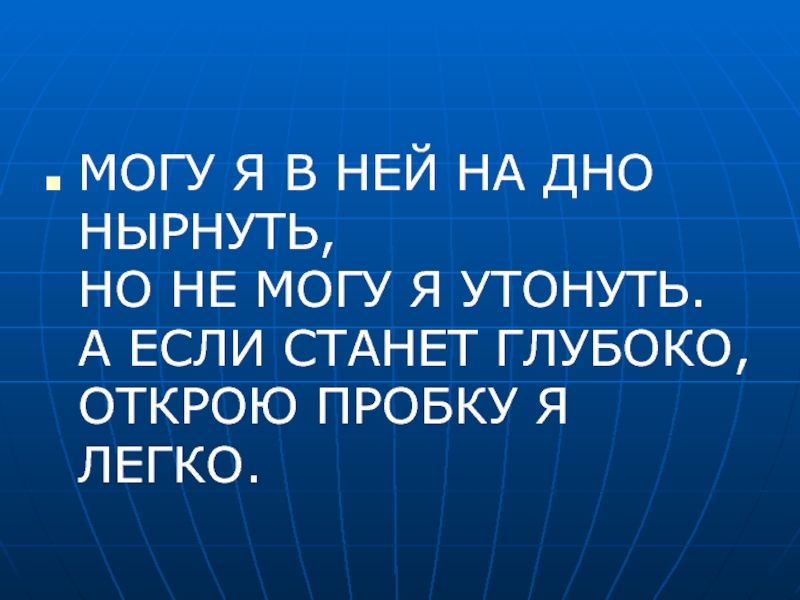 МОГУ Я В НЕЙ НА ДНО НЫРНУТЬ, НО НЕ МОГУ Я УТОНУТЬ. А ЕСЛИ СТАНЕТ ГЛУБОКО, ОТКРОЮ ПРОБКУ Я ЛЕГКО.