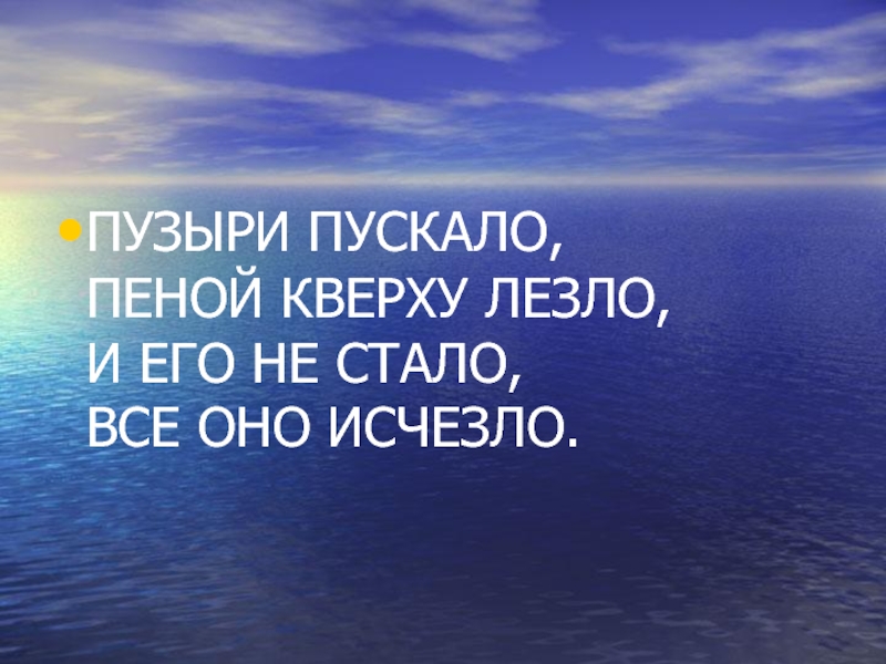ПУЗЫРИ ПУСКАЛО, ПЕНОЙ КВЕРХУ ЛЕЗЛО, И ЕГО НЕ СТАЛО, ВСЕ ОНО ИСЧЕЗЛО.