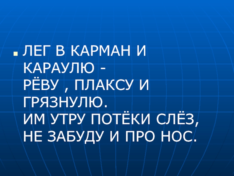 ЛЕГ В КАРМАН И КАРАУЛЮ - РЁВУ , ПЛАКСУ И ГРЯЗНУЛЮ. ИМ УТРУ ПОТЁКИ СЛЁЗ, НЕ ЗАБУДУ