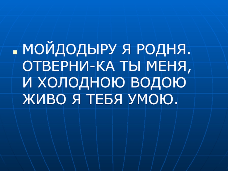 МОЙДОДЫРУ Я РОДНЯ. ОТВЕРНИ-КА ТЫ МЕНЯ, И ХОЛОДНОЮ ВОДОЮ ЖИВО Я ТЕБЯ УМОЮ.