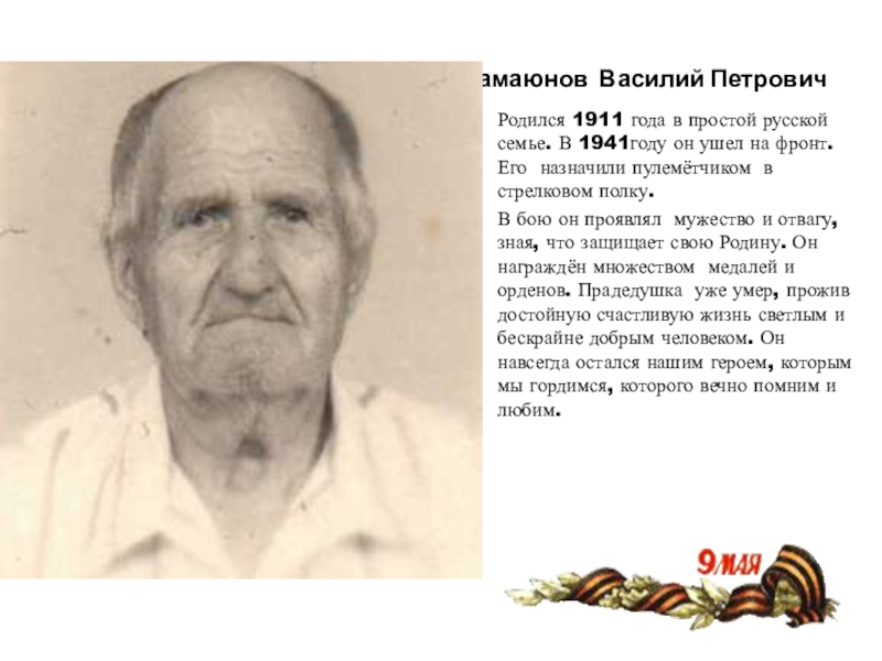 Гамаюнов Василий ПетровичРодился 1911 года в простой русской семье. В 1941году он ушел на фронт. Его назначили