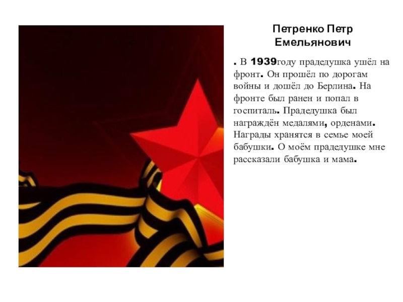Петренко Петр Емельянович. В 1939году прадедушка ушёл на фронт. Он прошёл по дорогам войны и дошёл до