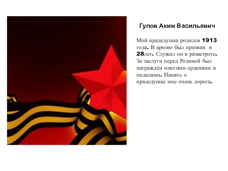 Гулов Аким ВасильевичМой прадедушка родился 1913 года. В армию был призван в 28лет. Служил он в разветроте.