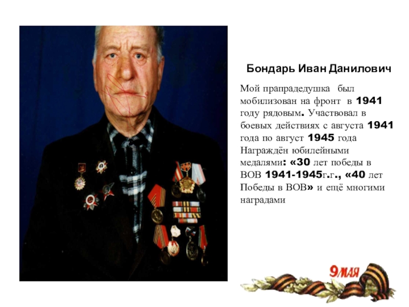 Бондарь Иван ДаниловичМой прапрадедушка был мобилизован на фронт в 1941 году рядовым. Участвовал в боевых действиях с