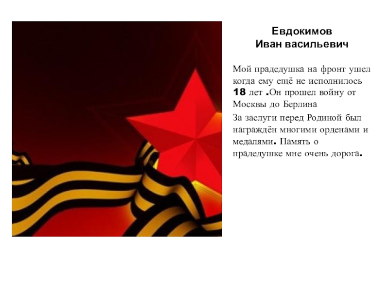 Евдокимов  Иван васильевичМой прадедушка на фронт ушел когда ему ещё не исполнилось 18 лет .Он прошел