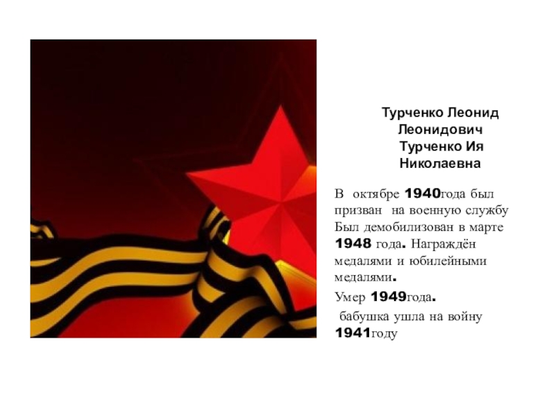 Турченко Леонид Леонидович  Турченко Ия НиколаевнаВ октябре 1940года был призван