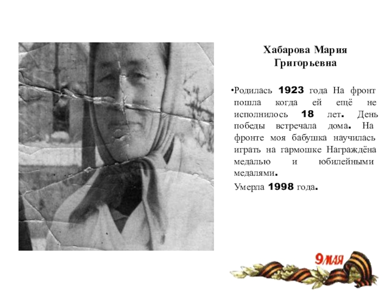 Хабарова Мария ГригорьевнаРодилась 1923 года На фронт пошла когда ей ещё не исполнилось 18 лет. День победы