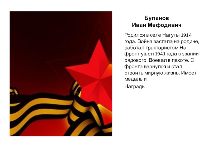 Буланов  Иван МефодивичРодился в селе Нагуты 1914 года. Война застала на родине, работал трактористом На фронт