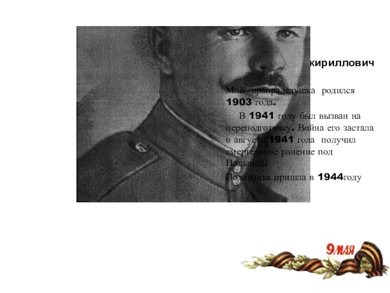 Криворот пётр кирилловичМой прапрадедушка родился 1903 года.  В 1941 году был вызван на переподготовку. Война его