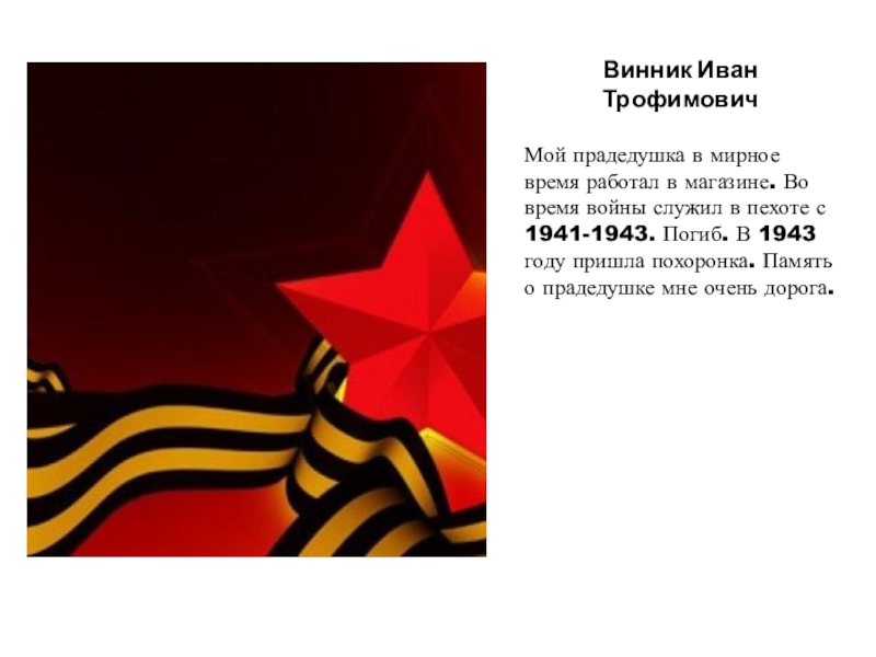 Винник Иван ТрофимовичМой прадедушка в мирное время работал в магазине. Во время войны служил в пехоте с