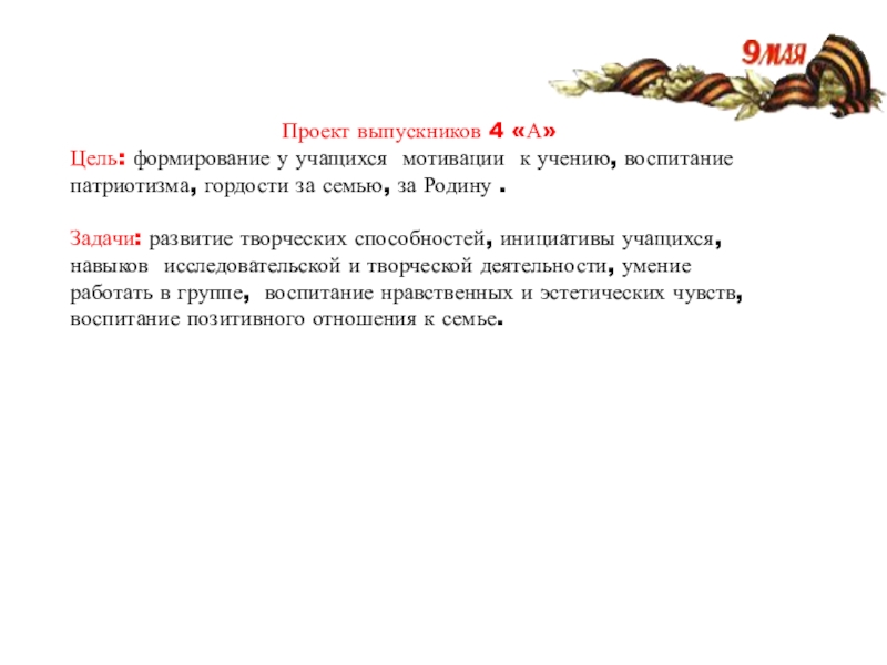 Проект выпускников 4 «А»Цель: формирование у учащихся мотивации к учению, воспитание патриотизма, гордости за семью, за Родину . Задачи: развитие творческих способностей, инициативы учащихся, навыков исследовательской и творческой деятельности, умение работать в группе, воспитание нравственных