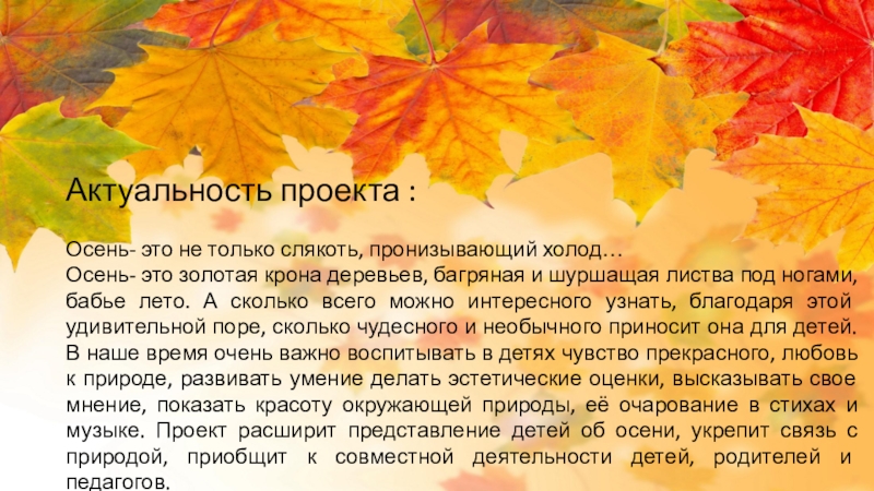 Расширить и систематизировать знания детей об осени, учить видеть и выделять отдельные объекты осенний природы.