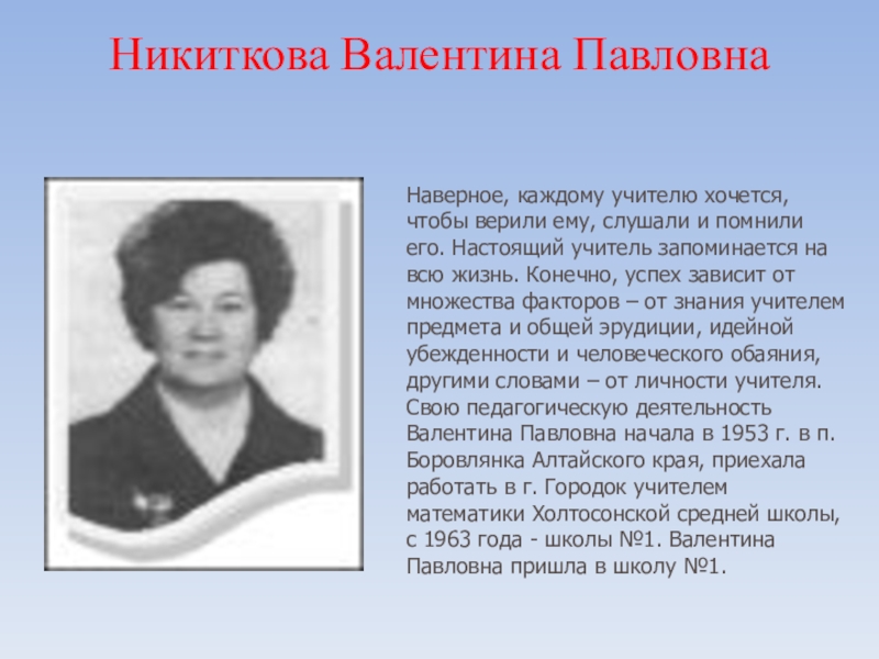 помнили его. Настоящий учитель запоминается на всю жизнь. Конечно, успех зависит от множества факторов – от знания учителем предмета и общей эрудиции, идейной убежденности и человеческого обаяния, другими словами – от личности учителя. Свою педагогическую деятельность Валентина Павловна начала в 1953 г. в п. Боровлянка Алтайского края, приехала работать в г. Городок учителем математики Холтосонской средней школы, с 1963 года - школы №1. Валентина Павловна пришла в школу №1.